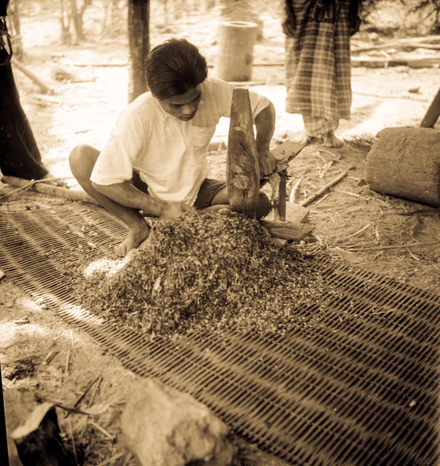 การหั่นใบยาสูบ บ้านสำโรงระวี อำเภอศรีรัตนะ ปี 2479