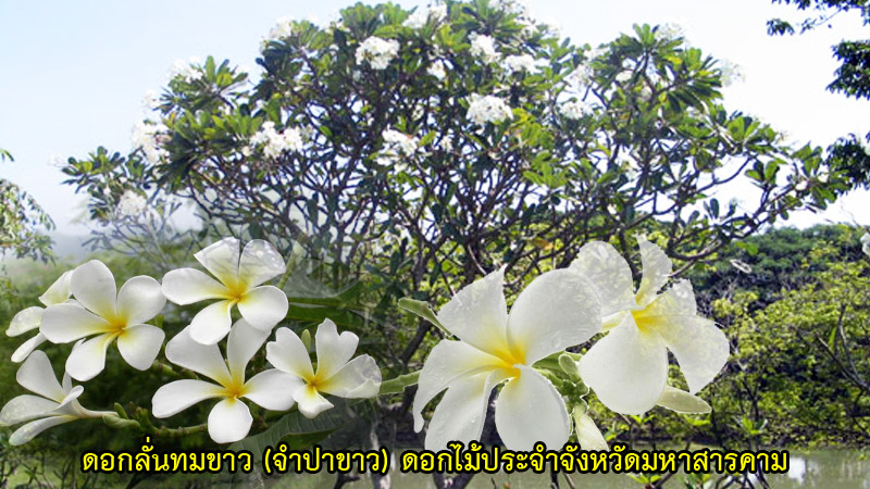 ดอกไม้ประจำจังหวัดมหาสารคาม คือ ดอกลั่นทมขาว (จำปาขาว ชื่อสามัญ Frangipani ชื่อวิทยาศาสตร์ Plumeria ssp.) ลั่นทม หรือ ลีลาวดี เป็นไม้ดอกยืนต้นในวงศ์ตีนเป็ด หรือ วงศ์ไม้ลั่นทม (Apocynaceae) มีหลายชนิดด้วยกัน บางคนมีความเชื่อว่า ไม่ควรปลูกต้นลั่นทมในบ้าน เพราะมีความเชื่อว่า เป็นอัปมงคล คือไปพ้องกับคำว่า 'ระทม' ซึ่งแปลว่า เศร้าโศก ทุกข์ใจ นิยมปลูกกันแพร่หลายอย่างมาก ชื่อพื้นเมืองอื่นๆ ได้แก่ จำปา, จำปาลาว และจำปาขอม เป็นต้น (สำหรับชื่อภาษาอังกฤษอื่นๆ ได้แก่ Frangipani, Plumeria, Temple Tree, Graveyard Tree)