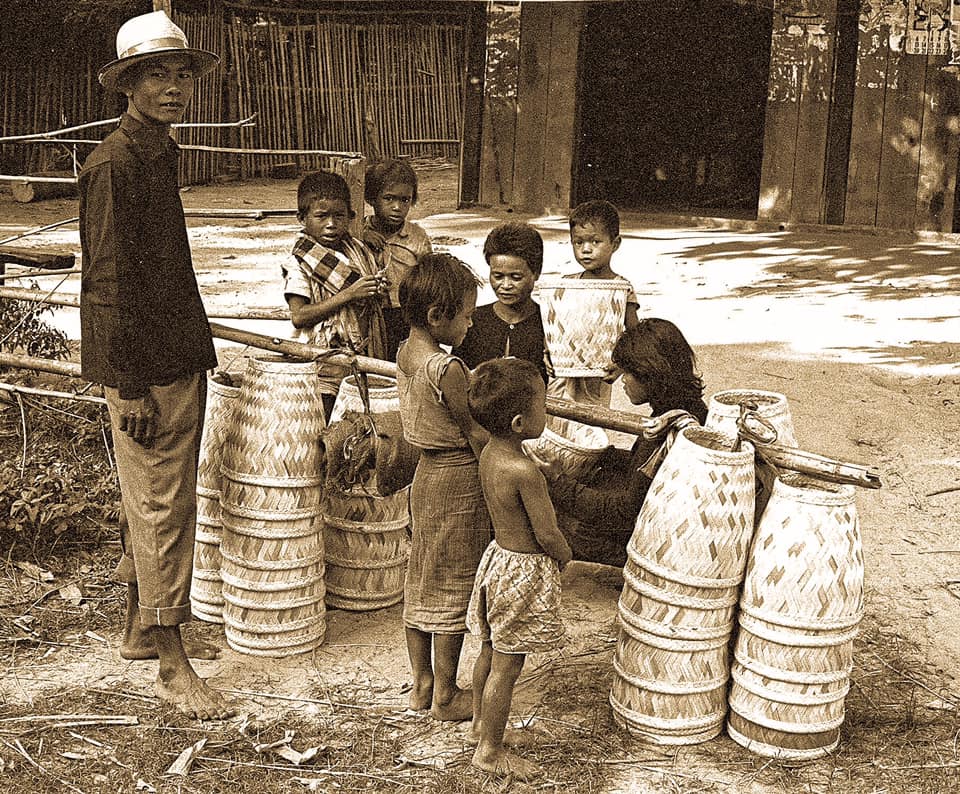 ชาวบ้านกำลังม้วนฝาไม้ไผ่สานสำหรับทำผนังบ้านไปขาย จังหวัดมหาสารคาม ตุลาคม พ.ศ. 2506