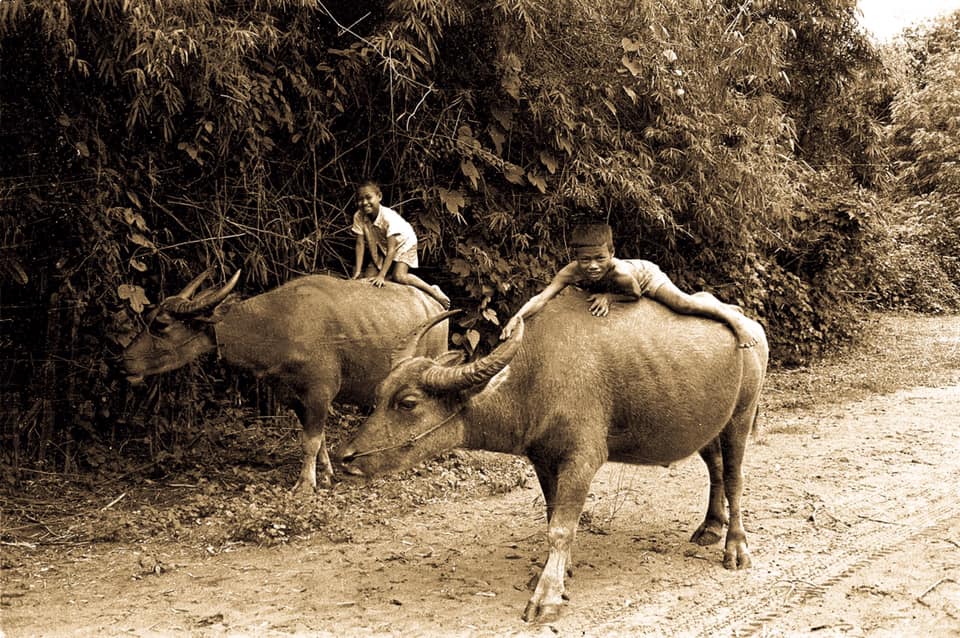 เด็กแว๊นซ์ในอดีตซิ่งบนหลังควาย ไปเลี้ยงที่ทุ่งนาบ้านหนองตื่น จังหวัดมหาสารคาม กรกฎาคม พ.ศ. 2506