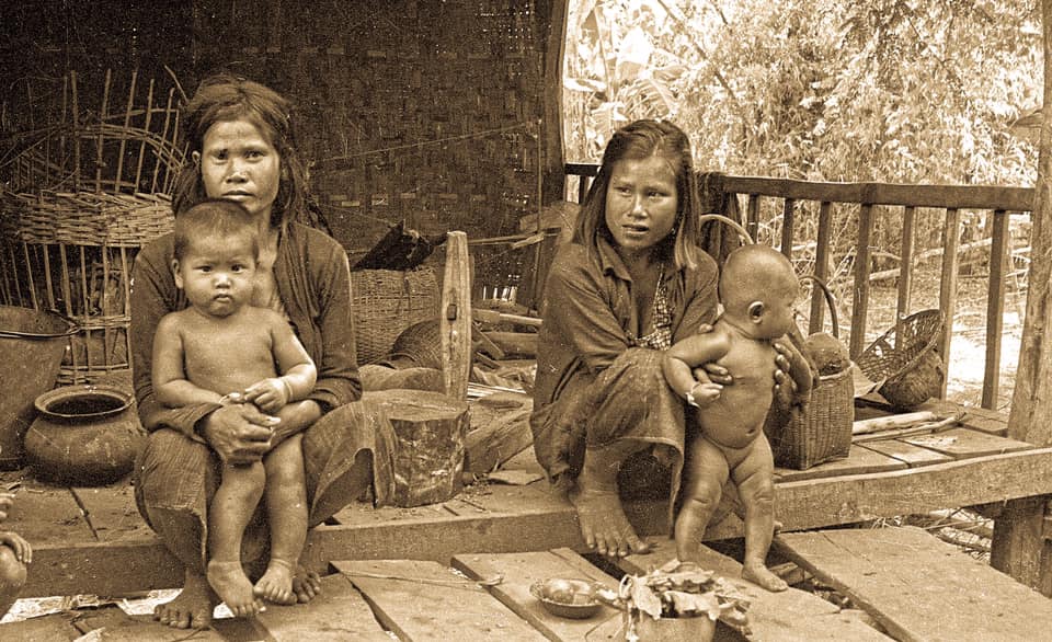 แม่ลูกอ่อนกำลังซดน้ำยาต้มในหม้อกรรม ระหว่างการอยู่กรรมหลังคลอด บ้านหนองตื่น อำเภอเมือง จังหวัดมหาสารคาม พ.ศ. 2507