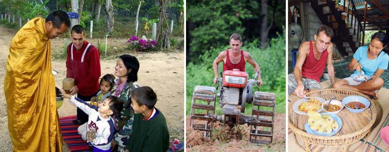 บางครั้งก็คิดหนีไปที่อื่นเหมือนกัน แต่ผมไม่รู้ว่าถ้าอยู่ที่นี่ไม่ได้จะไปอยู่ที่ไหน คิดว่าเราต้องหาคำตอบให้ได้ ปัญหาอาจจะอยู่ที่ตัวของผมเอง แต่ในภาพรวมที่นี่ดี สิ่งแวดล้อมดี สะอาด ถ้าเรามีลูกเราอยากให้ลูกของเราอยู่ในที่สะอาด อาหารธรรมชาติฟรีๆ ก็มีเยอะมาก ในภาคอีสาน เห็ดแดง หน่อไม้ ไข่มดแดง ดอกกระเจียว ผักอีหรอก แมงคับ แมงคาม ขี้กะปอมเยอะ แต่บางคนก็ไม่กินนะ บางคนก็กิน ซึ่งมันดีมากเพราะว่า 1) สะอาด อาหารธรรมชาติ ไม่มีใครไปใส่ปุ๋ยเคมี 2)ไม่ได้ซื้อ ไม่ได้ใช้เงิน ขอให้ขยันเดินไปเก็บ สมัยก่อน ที่อังกฤษผมจะเดินแบกอิฐทั้งวัน เมื่อได้เงินแล้วก็เอาเงินเกือบทั้งหมดไปซื้ออาหารในร้าน ฝรั่งส่วนมากทำงานหนักทุกวัน แต่เงินที่เขาได้มันเพียงพอที่จะซื้ออาหารกินเท่านั้น ไม่มีเงินเหลือฝากธนาคาร